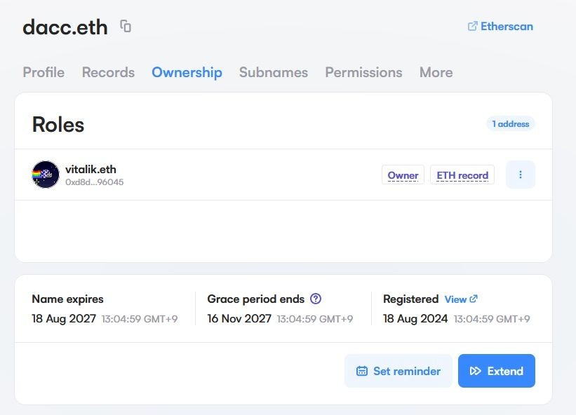 Виталик Бутерин зарегистрировал в службе имен Ethereum (ENS) доменное имя "dacc.eth" за 0,187 ETH (~$500)