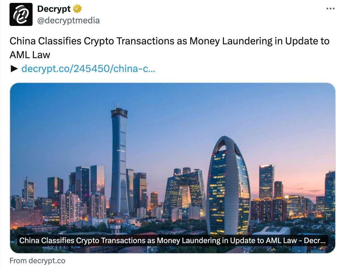 🇨🇳 Правительство Китая признало транзакции с виртуальными активами методом отмывания денег