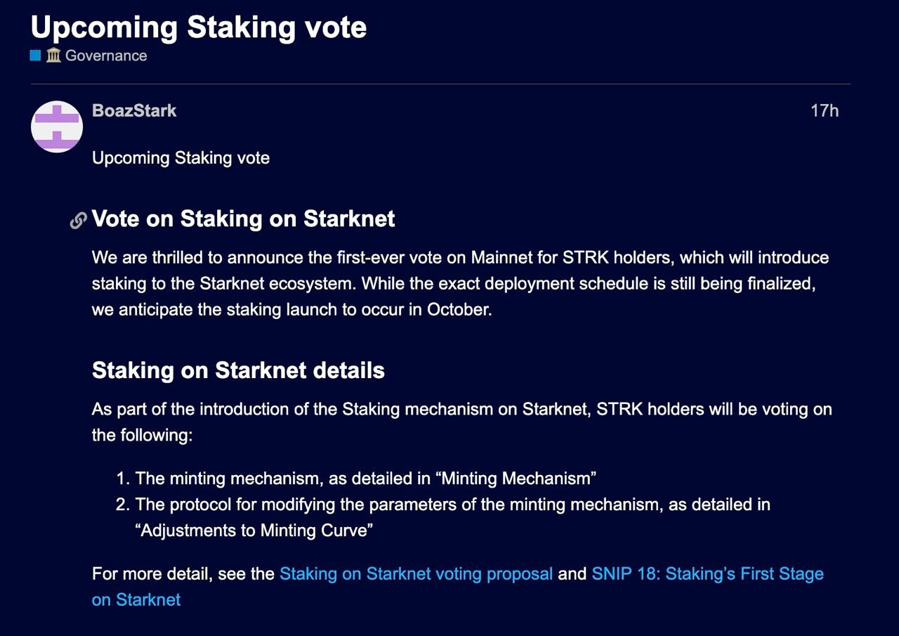 В рамках введения механизма стекинга в Starknet держатели STRK будут голосовать по следующим вопросам: