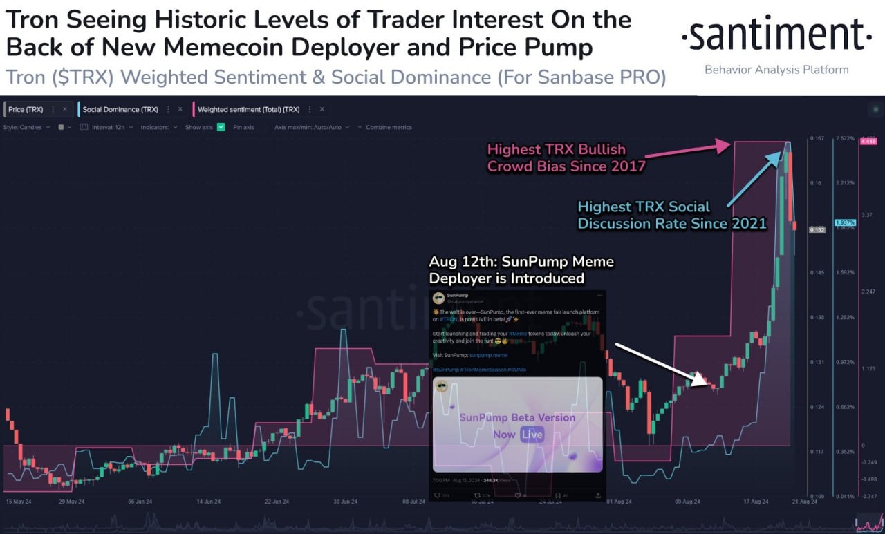 С 12 августа было запущено более 7000 новых монет, а рыночная стоимость TRX выросла на 22%, достигнув пика чуть более $0,165.