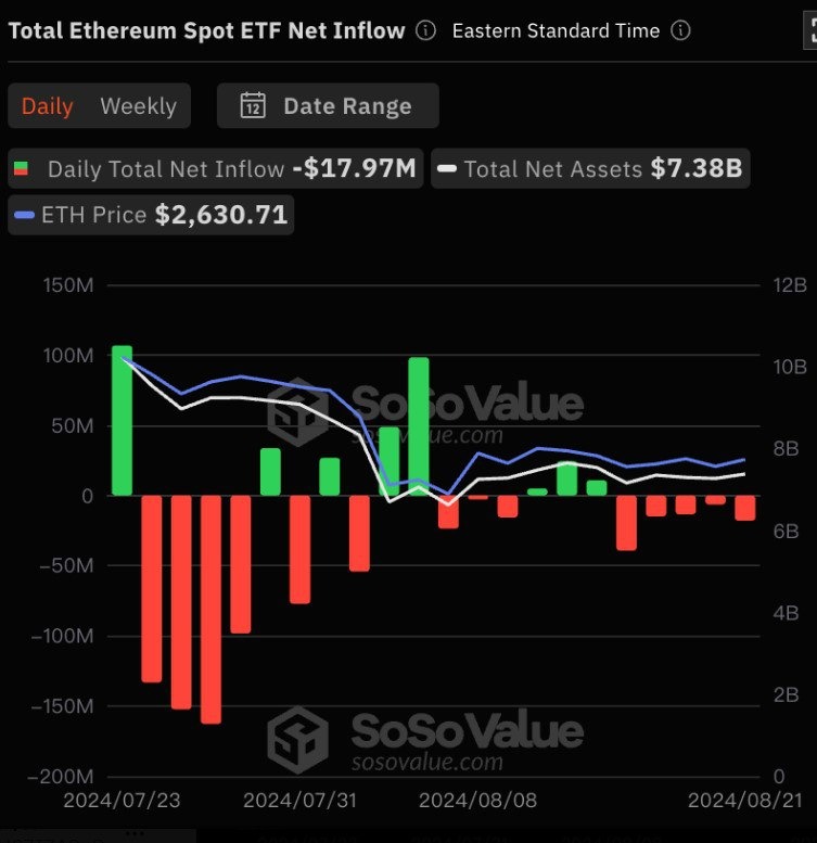 🔸Ежедневный общий чистый приток: -$17,97 млн