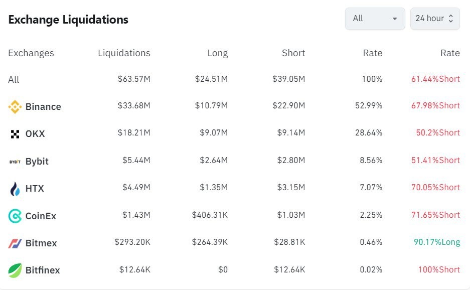 За последние сутки было ликвидировано 30 778 позиций трейдеров, общая сумма ликвидаций составила $63,56 млн.