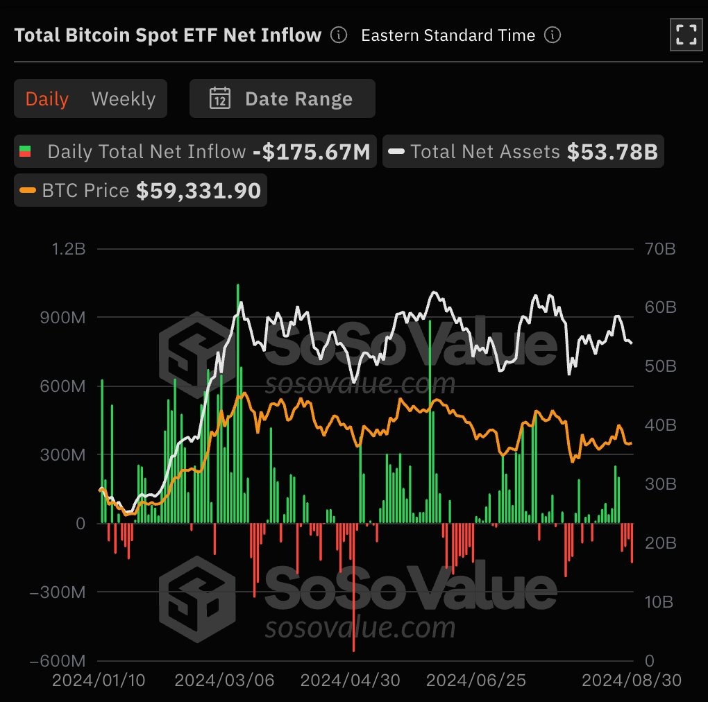 За сутки Galaxy (BTCO), Fidelity (FBTC), Bitwise (BITB), Ark Invest and 21Shares (ARKB) и Grayscale (GBTC) суммарно продемонстрировали отток на 175,67 млн.