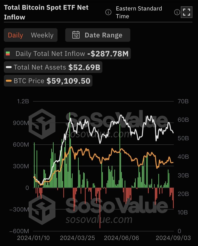🔸Ежедневный общий чистый приток: -$287,78 млн