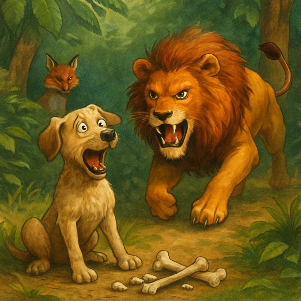 The dog notices and starts to panic but as he’s about to run he sees some bones next to him and gets an idea and says loudly “mmm…that was some good lion meat!”. The lion abruptly stops and says ” woah! This guy seems tougher then he looks, I better leave while I can”.