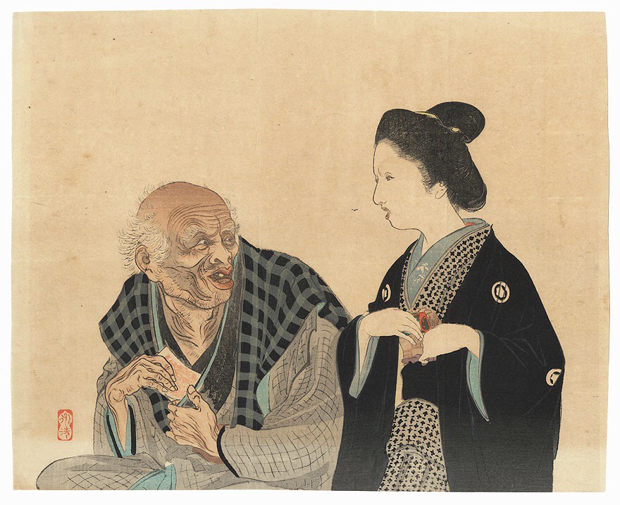 На фото: Красавица и старик. Работа Томиока Эйсэн, 1901. Иллюстрация к новелле «Краски осени». Старик алкоголик продаёт свою дочь в бордель, чтобы на вырученные деньги предаваться пьянству. Здесь запечатлён момент совершения сделки
