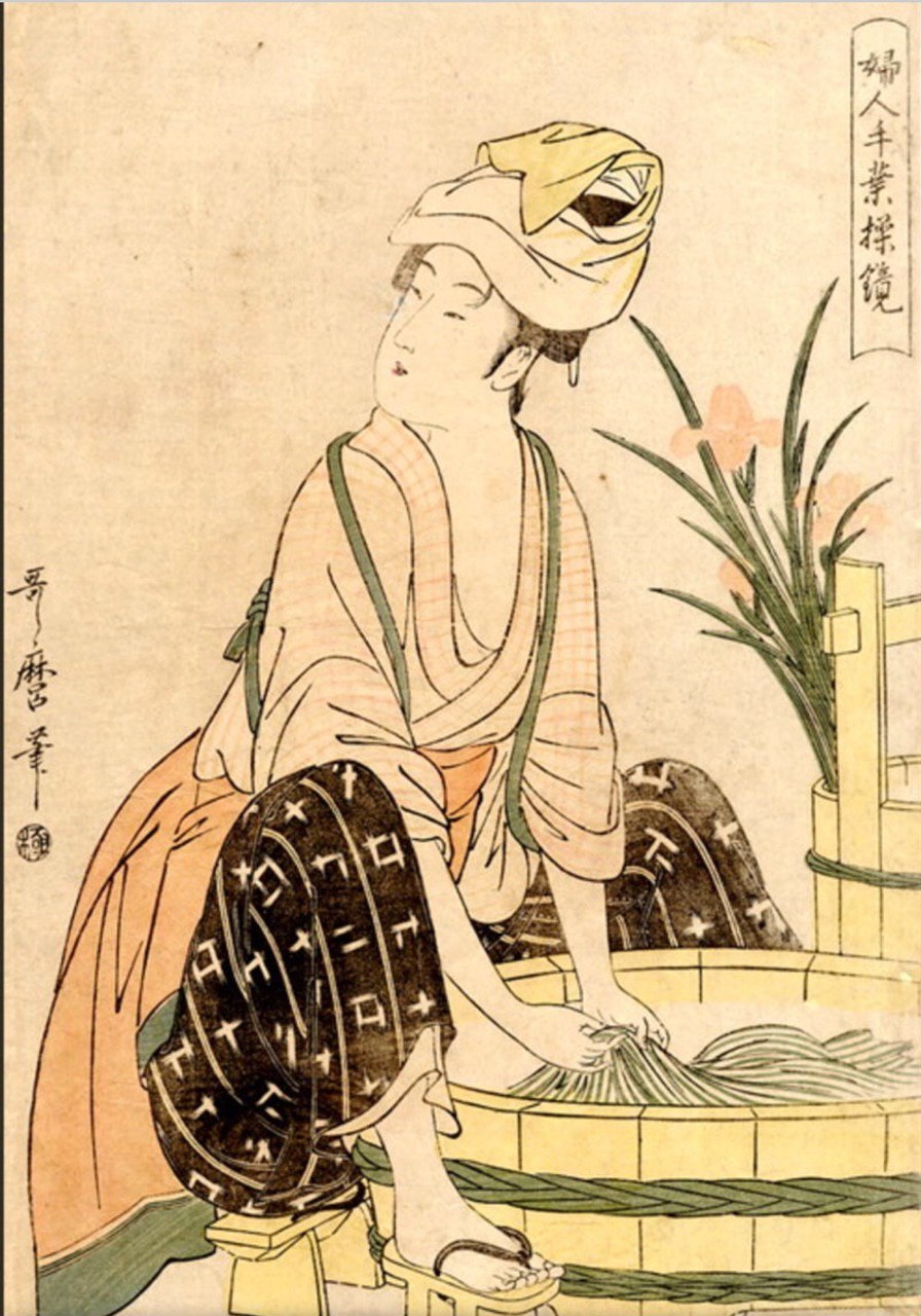 На фото: Китагава Утамаро, «Стирка», 1790 год. Здесь стирает женщина, гравюру со стирающим мужчиной найти не удалось