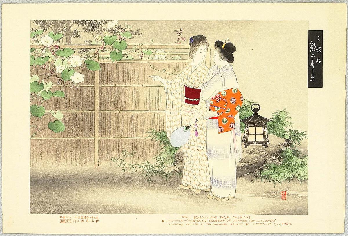 Ямагути Сэйсон (1892-1988) описывает приятную летнюю традицию чаепития на природе ( «нодатэ» — дословно «подача в поле»), когда чайная утварь упаковывается в изящную переносную коробочку, а потом сервируется прямо на траве.