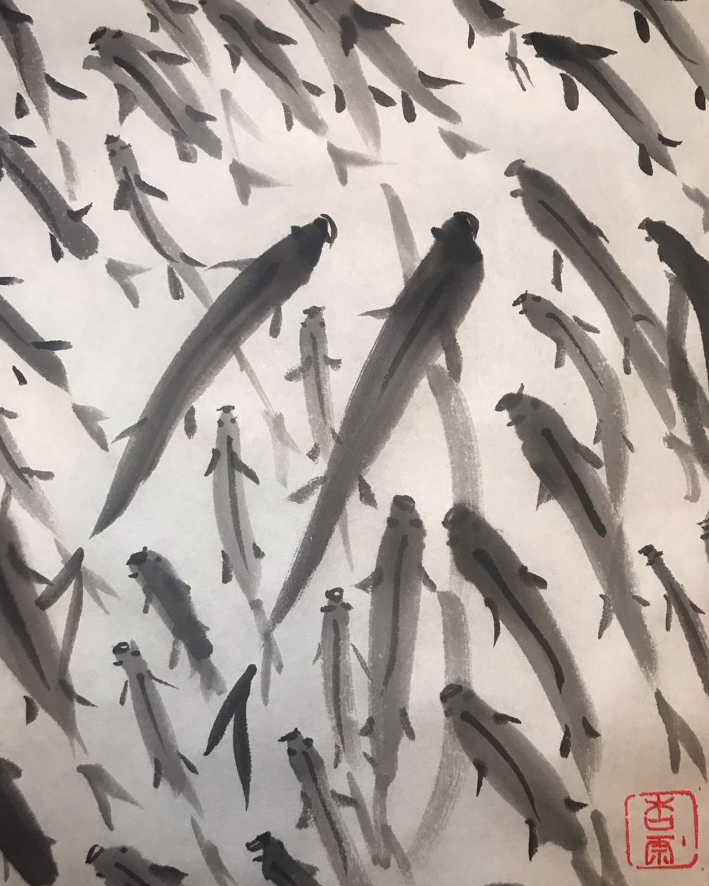 Вот смотрю на свою работу и удивляюсь, неужели это я написала вот только что? Уже в самом начале я поняла, что-то пошло не так и было желание бросить — не тот мазок, не та композиция, но потом процесс затянул меня, и в итоге получилась немного неожиданная по интенсивности вещь — безумная стая рыб, несущаяся куда-то без видимой цели. Возможно, это дает представление и о моем нынешнем состоянии, когда картинка отражает настроение её автора.