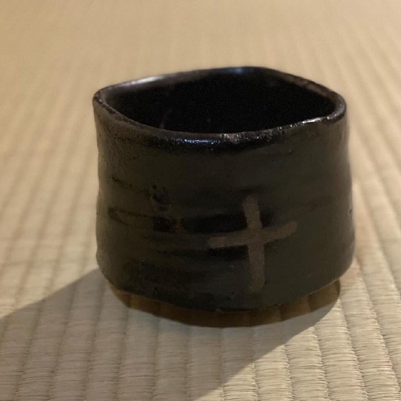 НА ФОТО: чайная чаша сэтогуро (керамика сэто с чёрной глазурью) с изображением креста
