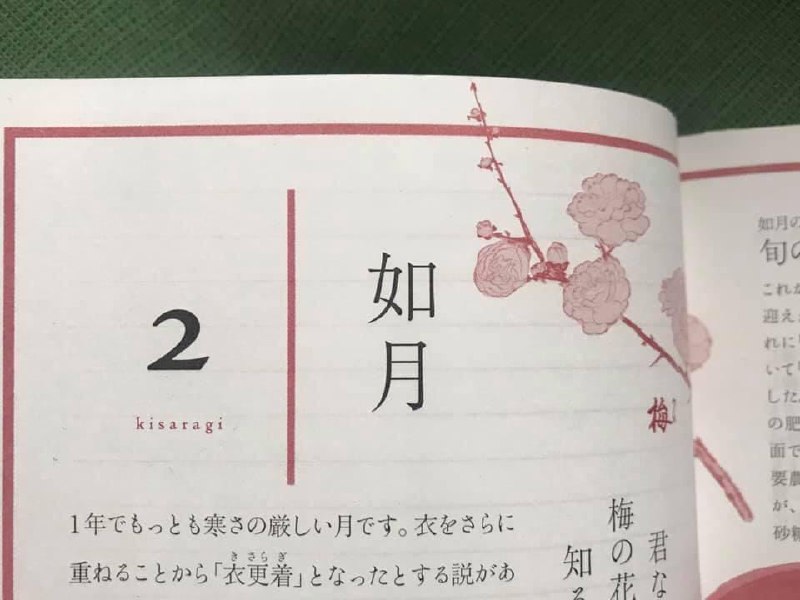 Второй месяц, самый холодный в году, носит поэтическое название «кисараги» и записывается вот такими иероглифами 如月. Правда, иероглифы и их чтения в данном случае совершенно не очевидны. Боюсь, даже японцам приходится заучить, что вот эти два иероглифа вместе читаются именно так.