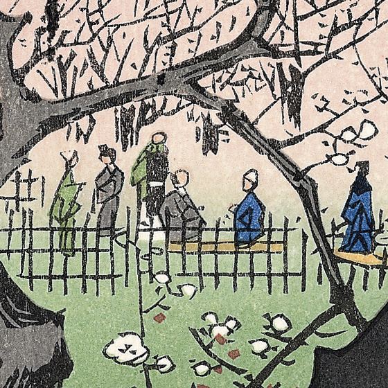 На фото: Утагава Хиросигэ. «Сливовый сад в Камэйдо». Фрагмент. Кажется, парочка людей точно пристроилась, чтобы вкусить крепкого под цветущими сливами