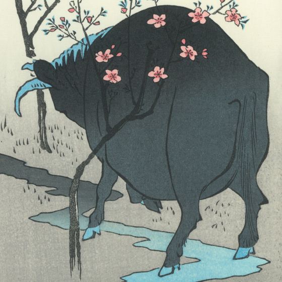 НА ФОТО: Утагава Хиросигэ «Бык в персиковой роще». Этот сюжет пришёл в Японию из Китая, где означал конец войны.