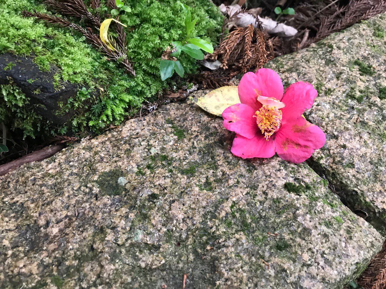 НА ФОТО: опавший цветок камелии, который я сфотографировала около храма девятиглавого дракона в Хаконэ несколько лет назад