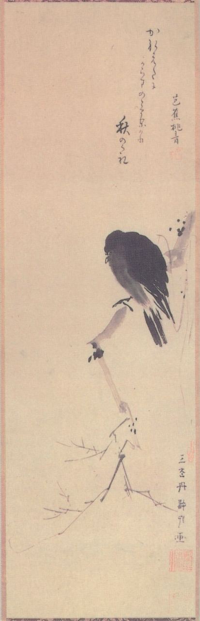 В оригинале нет слова «замерзший», просто Басё и не нужно было подчеркивать, что ворон «озяб», слишком уж хорошо был известен японской интеллектуальной публике того времени этот мотив, пришедший еще из китайской классики — «озябший ворон на старом дереве» 古木寒鴉. (Сейчас это выражение в Японии даже используется как «дзенское», пишут его на на свитках и читают как «кобоку канга»). Но я решила добавить «озябшего» ворона, чтобы точнее передать читателю контекст, ведь не все знакомы с китайской классикой.