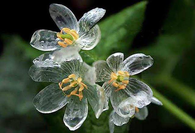 НА ФОТО: Нет, это не искусственный цветок из льда, а самый настоящий живой цветок — он становится прозрачным, когда идет дождь. По-японски он называется サンカヨウ (санкаё:), а по-русски - двули́стник Гре́я