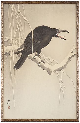 НА ФОТО: Охара Косон как раз показывает каркающего зимнего ворона. С одной стороны, прекрасный умиротворенный зимний пейзаж, а с другой — неприятный красный язык и острый распахнутый клюв ворона.