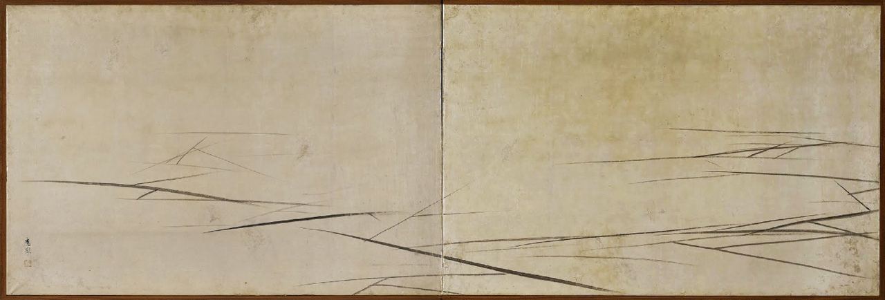 В очередной раз разглядывая эту ширму, я вспомнила зимнее трёхстишие Басё, где он использует красивое сезонное слово «фуюгарэ» — оно означает «зимнее увядание», «мертвый сезон», которое очень подходит этой ширме: