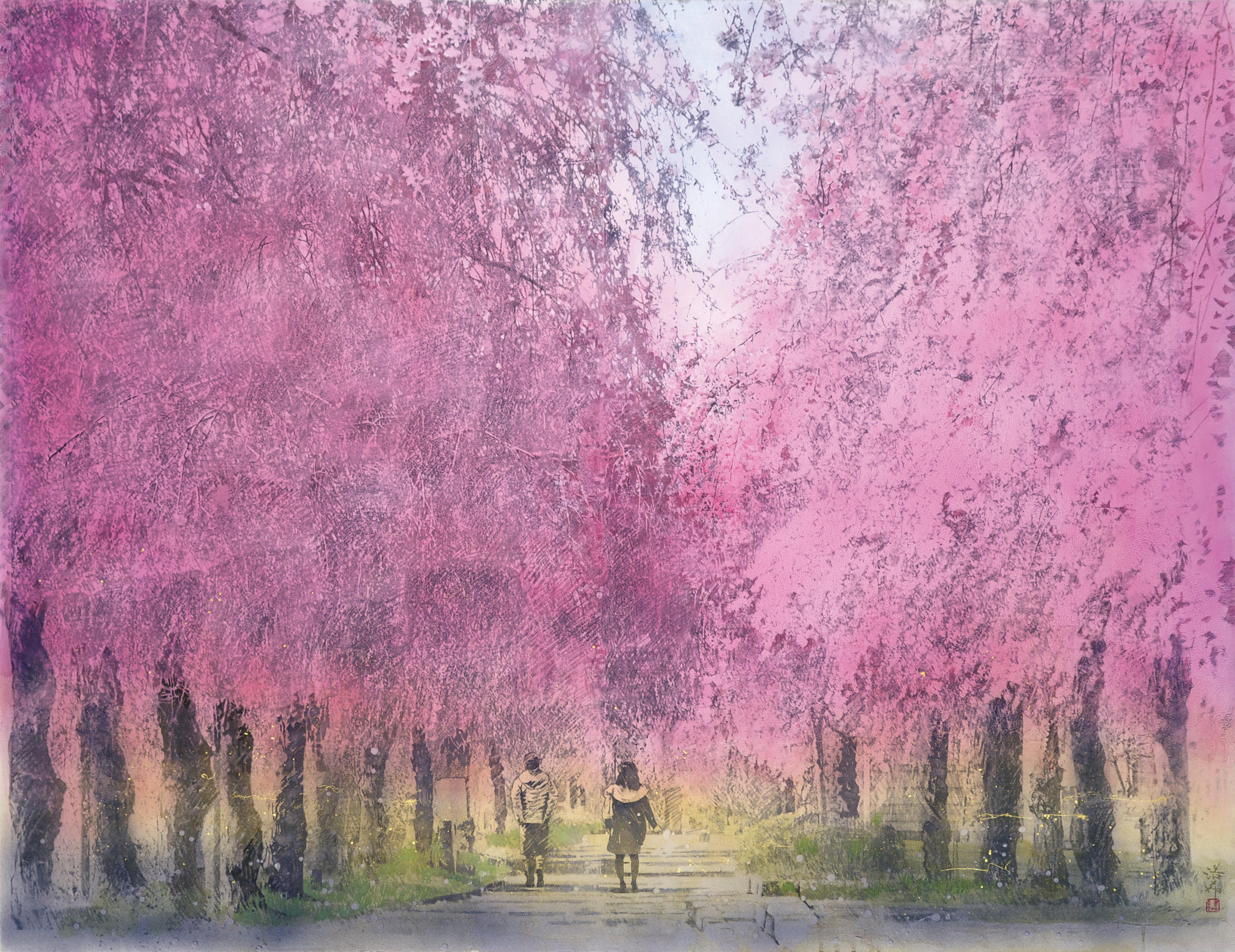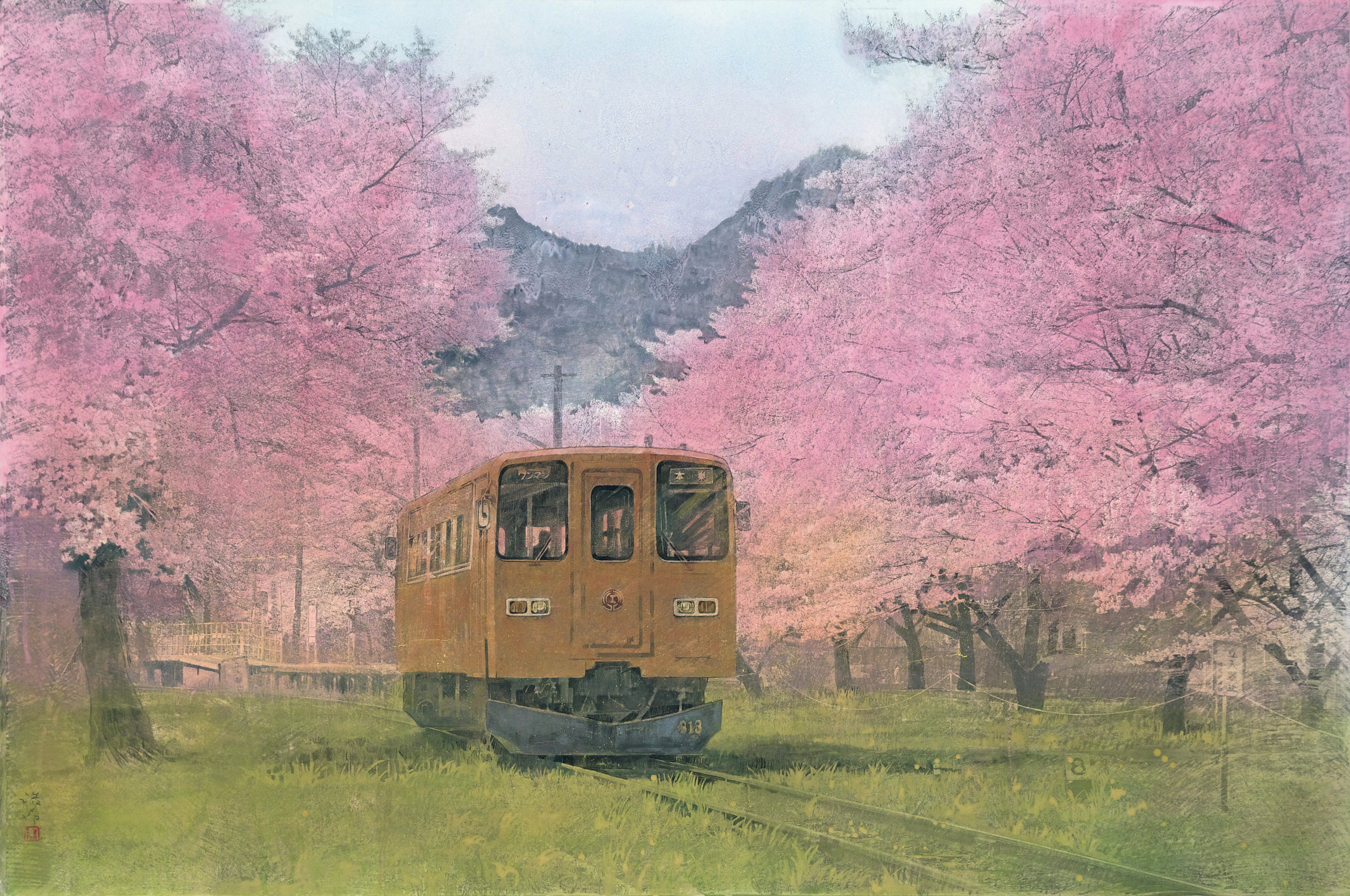 НА ФОТО: «Таруми. Сакура в полном цвету», Кисимото Хироки. Это работа молодого японского художника (родился в 1982 году) в жанре «нихонга», на которой изображено популярное место для фанатов поездов и цветущей сакуры — поезд на железной дороге Таруми в префектуре Гифу
