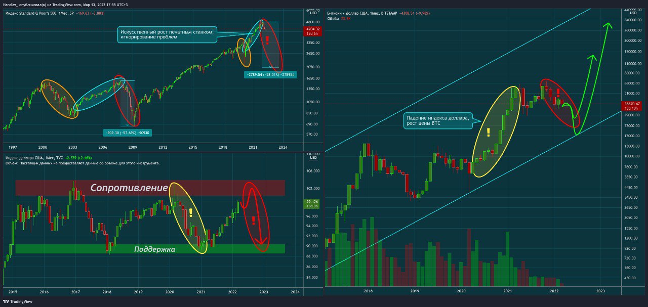 SPX 1мес., DXY 1мес., BTC/USDT 1мес. Для начала обратимся к общей экономической ситуации в мире и проанализируем движение индекса S&P. На данный момент ситуация на графике очень похожа на колебания в 2000-2009г. Можно провести огромное количество сходств…