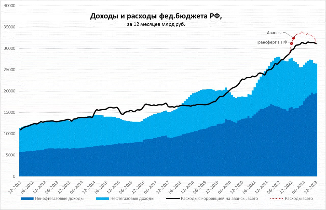 ❗️В итоге июнь был закрыт с профицитом бюджета 0.8 трлн руб., дефицит с начала года 2.6 трлн. Это подтверждается и резким ростом остатков на счетах Минфина в банках в виде депозитов/РЕПО до 8 трлн руб. на 28 июня. Но мы не знаем как авансы/трансферты конца 2022 года-начала 2023 года распределятся до конца года, потому большого оптимизма пока нет, расходы рисуются в диапазоне 31-32 трлн руб. (минус 1.5 трлн руб. декабрьского трансферта в Пенсфонд), доходы идут в район 26-27 трлн руб., даже несмотря на слабость нефтегазовых доходов. Пока не вижу смысла менять ожидания дефицита 3.5-4.5 трлн руб., что вполне вполне адекватно ждать по итогам года и это не критично в пределах 3% ВВП.