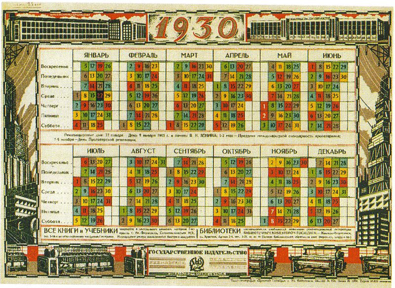 27 августа 1929 года постановлением СНК СССР была введена так называемая пятидневная рабочая неделя. Семидневная неделя была ликвидирована, вместо неё стало четыре рабочих дня, а пятый — выходной. Одновременно с этим был введен трехсменный непрерывный график работы. Обосновывалось это достижением максимальной загруженности промышленного оборудования с одной стороны, и увеличением количества выходных дней — с другой. Осенью начался постепенный переход на "непрерывку", который завершился весной 1930 года. Это стало введением нового, универсального календаря — рабочая неделя теперь представляла собой так называемую пятидневку с одним выходным днем. Таким образом, в году насчитывалось 72 пятидневки и каждое 1 января начиналось с первого дня пятидневки. Дни недели так и назывались: первый день пятидневки, второй, третий и т.д, при этом все рабочие были разделены на пять групп, названных по цветам (жёлтый, розовый, красный, фиолетовый, зелёный), и каждая группа имела свой собственный выходной (нерабочий) день в неделю. То есть, в общем и целом, у всех работающих оставалось 77 (или 78 в високосные годы) дней отдыха.