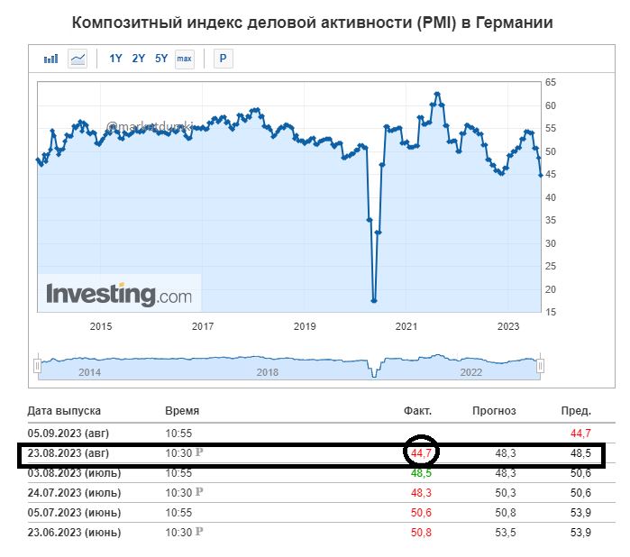 Композитный (сфера услуг + производственный сектор) же индекс деловой активности опустился вообще до 44.7 пунктов (см. внизу). Так низко индекс не опускался даже летом 2022 года, когда цены на газ взлетали до 3 тыс $ за 1000 кубометров. Только во время тотального локдауна весной 2020 года этот показатель был ниже текущих 44.7 пунктов.