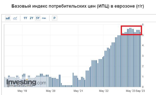 Интересная ситуация с базовой инфляцией в Еврозоне. Если в США этот показатель после пика летом прошлого года резко пошел вниз (https://t.me/markettwits/251454), то в Еврозоне картина другая. На графике внизу видно, что после достижения пика на уровне 5.7% г/г, никакого особенного снижения и не видно. Так и болтается этот показатель выше 5% и пока упорно отказывается идти вниз несмотря на ужесточение денежно-кредитной политики, которое проводит ЕЦБ. Уже даже экономики Германии (https://t.me/MarketDumki/4299) и Нидерландов успели войти в рецессию, что, казалось бы, должно было сбить рост цен в Еврозоне. Но пока этого нет.