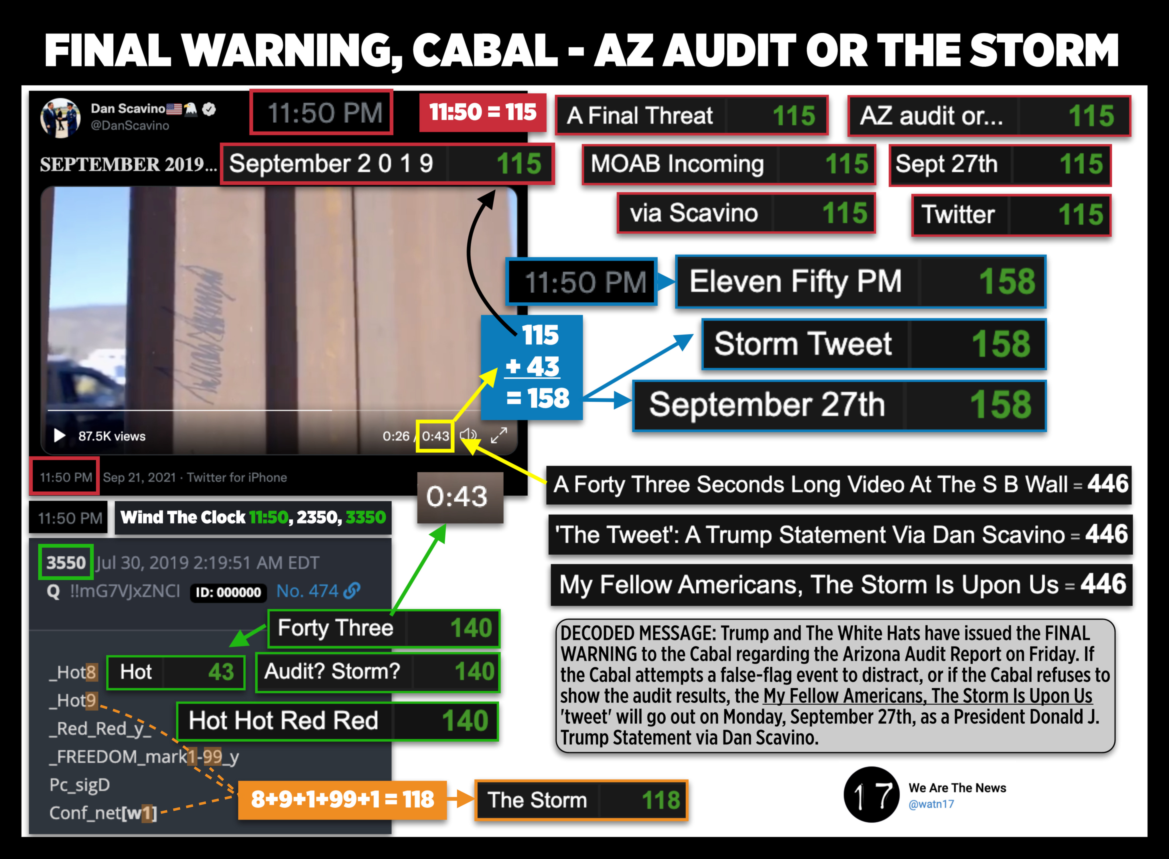 Dan issues this final warning via the 11:50pm posting time and a 0:43 second video from the Souther Border Wall. The phrase SEPTEMBER 2019 = 115, matching the posting time's 115 digits. 115 = A FINAL THREAT = AZ AUDIT OR... = MOAB INCOMING = SEPT 27TH = VIA SCAVINO = TWITTER.