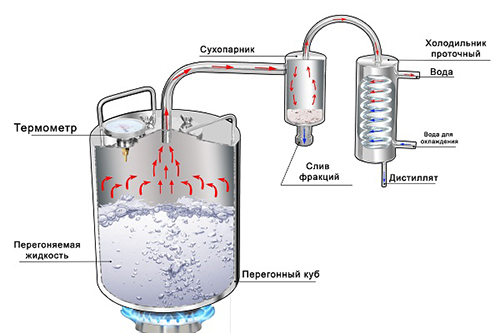 Принцип работы установки для самогоноварения (дистилляции) основывается на том, что температура закипания и испарения соединений, присутствующих в браге, разная. При нагревании бака с брагой отмечается процесс испарения её компонентов. Образующиеся пары направляются в конденсатор, конденсируются в жидкость на его внутренней поверхности, после чего стекают из змеевика в емкость для сбора готового алкоголя.