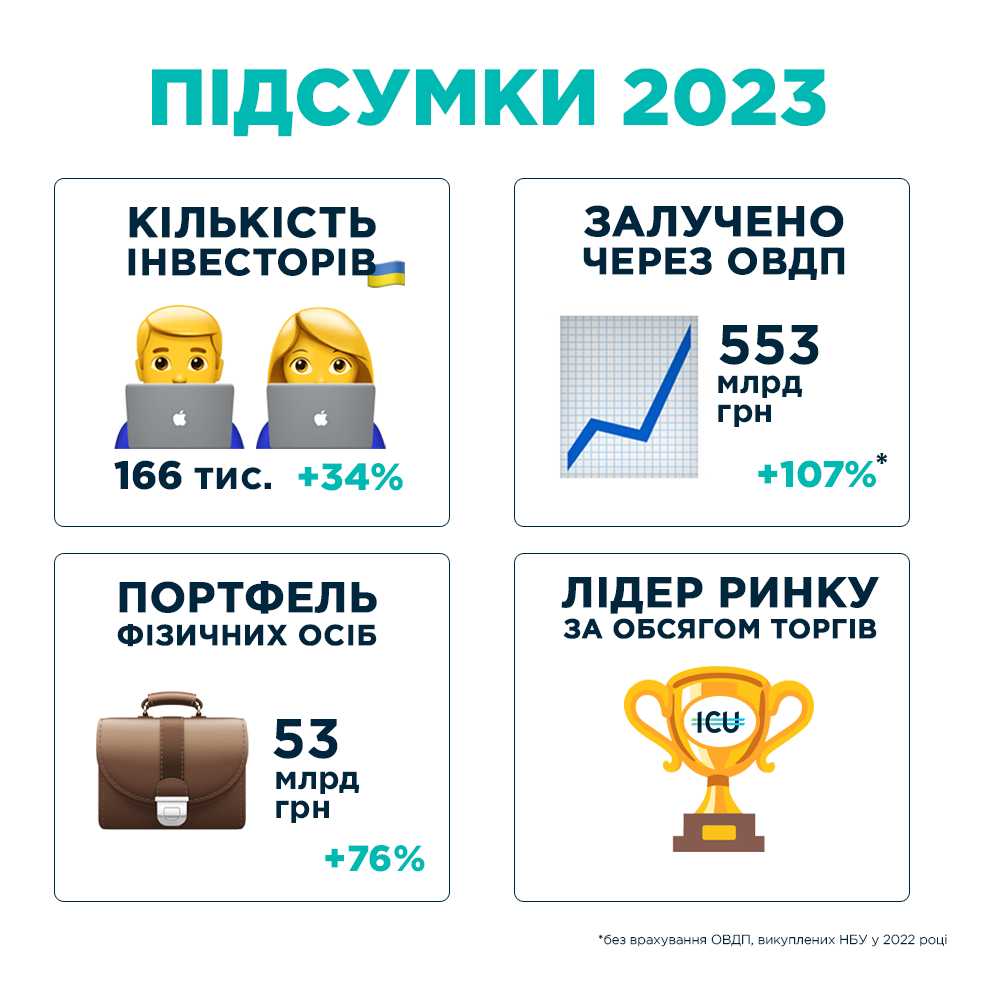 Всього, за даними Мінфіну, з 3 жовтня 2022 по 1 січня 2024 року в Дії було продано цінних паперів на 2.8 млрд грн — тобто станом на початок цього року кожна друга облігація була придбана через ICU 💪