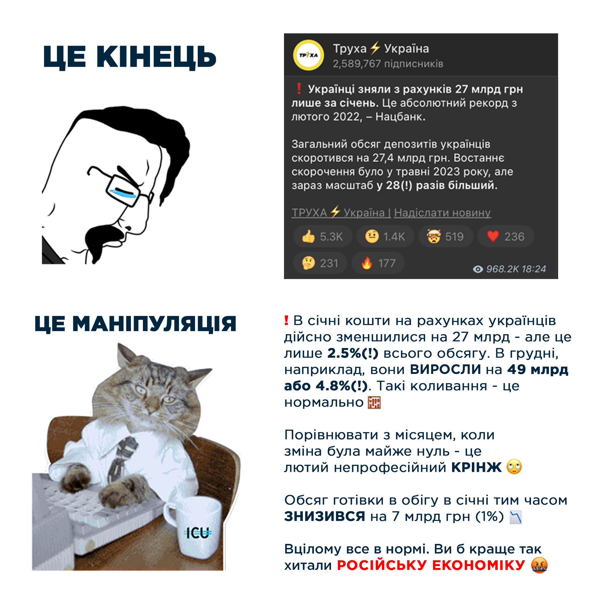 ✋ Такі новини — це чистої води маніпуляція. Справді, в січні обсяг коштів населення у банках знизився на 2.5%. Звучить не дуже по-алярмістськи? Це 27 млрд грн. Ми говоримо тут про зміну, тобто буває як зростання, так і падіння депозитів. Для порівняння взято місяць, коли кількість депозитів не змінилася – в травні минулого року скорочення склало всього 0.1%. І це «чудова» база порівняння. Хочеш, малюєш зраду, що темпи падіння зросли у 27 раз у січні й незабаром нам всім гаплик. А хочеш, малюєш перемогу – в грудні в 50 раз приріст. В будь-якому випадку, виходять дурниці й так не треба робити.