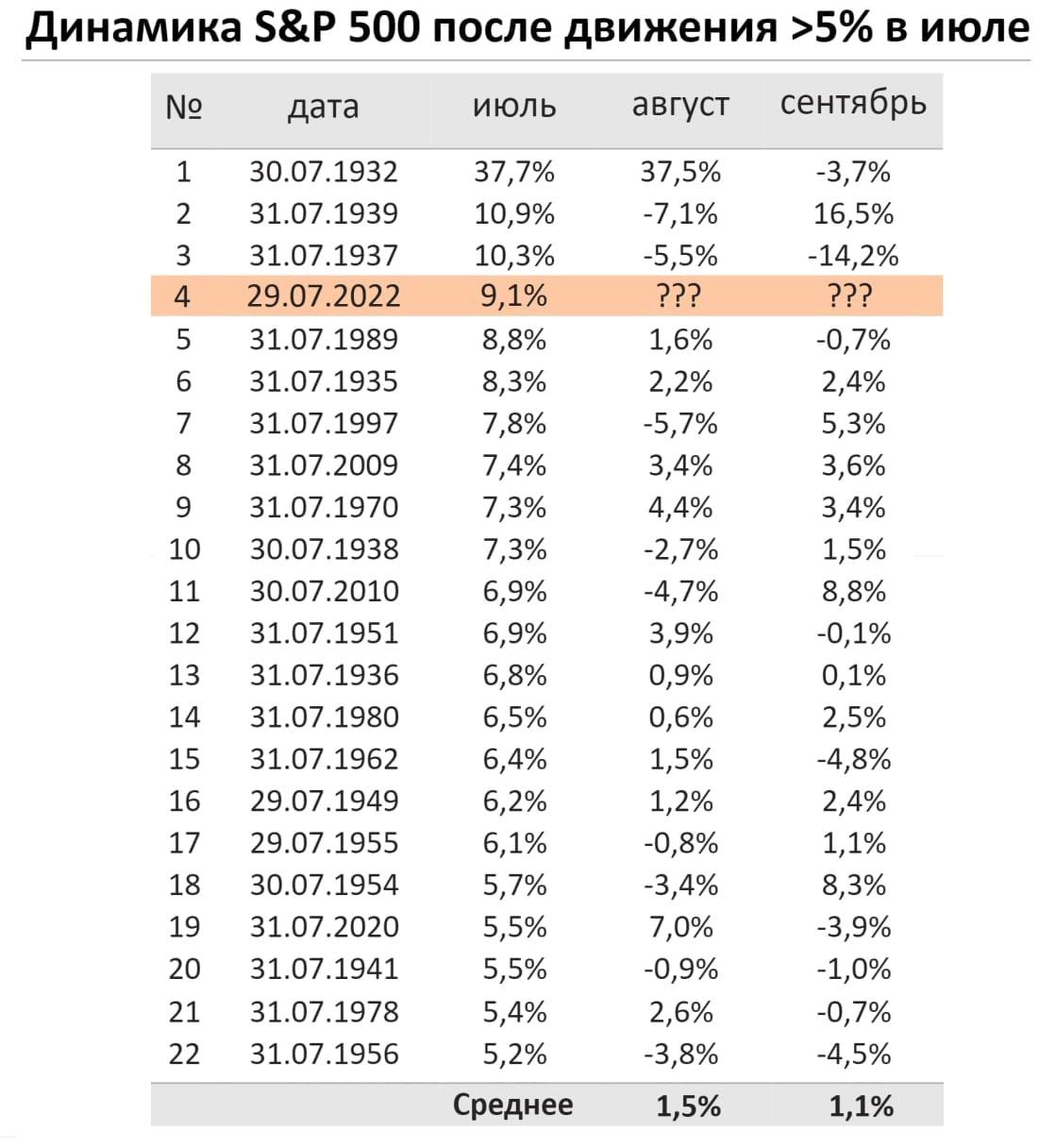 Июль 2022 года стал 4-м месяцем в истории американского фондового рынка по показателю прироста котировок. Согласно нашей статистике, обычно после сильного июля в августе и сентябре — тоже был рост, но куда более слабый.