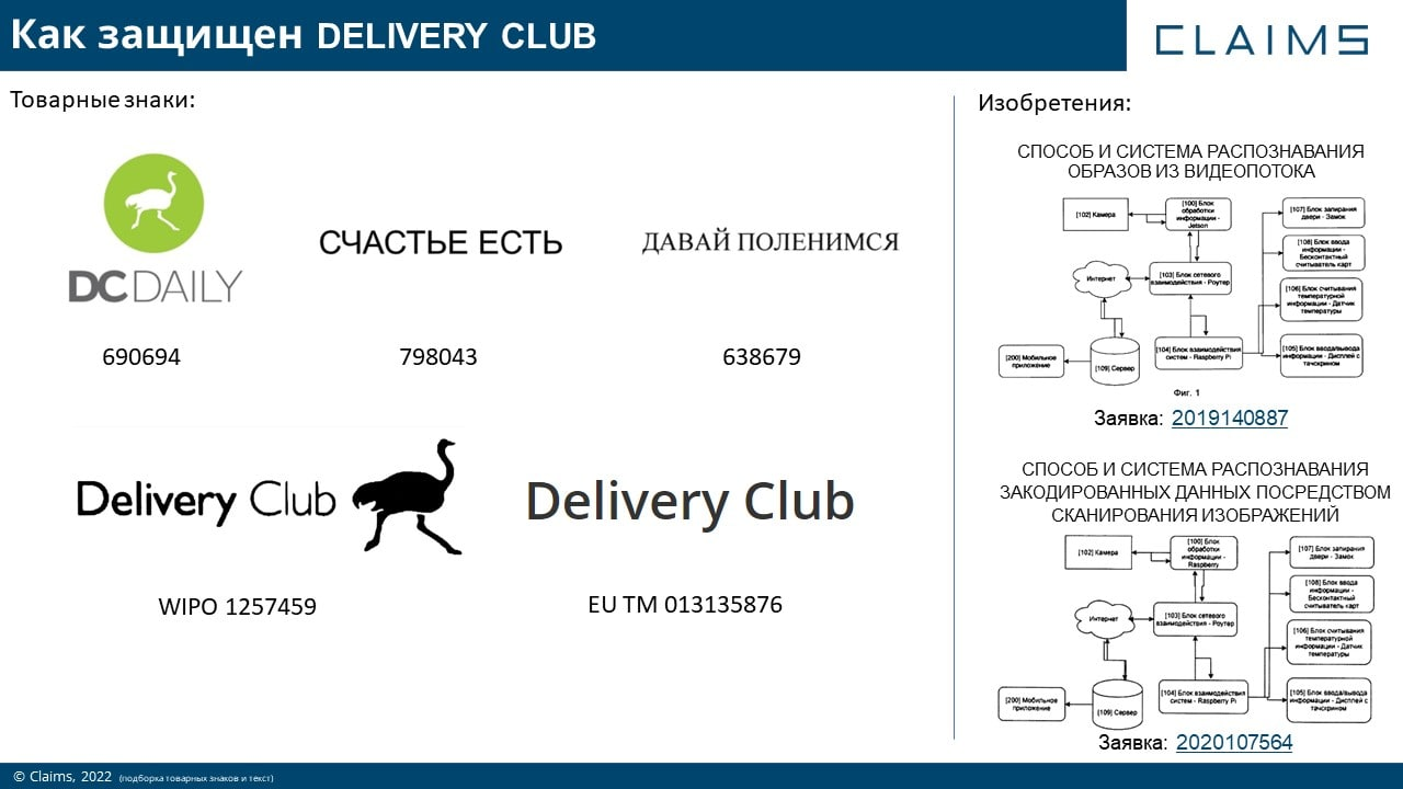 На имя ООО "Деливери Клаб Дейли" были получены два патента на изобретения — системы распознавания объектов через видео. Предположим, что компания намеревалась внедрять магазины без касс, в которых деньги списываются автоматически за каждый товар, который покупатель взял с полки.