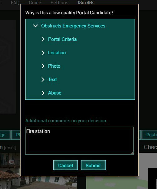Reddit user jamonathin reports that a new feature appeared on the OPR system, that asks the reason for marking a portal candidate as low quality. There are 5 main option, each of them has other sub-choices.