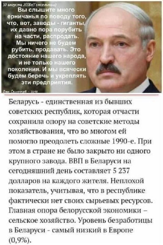 Скажу честно, одним из самых умных, эффективных, толковых руководителей я всегда считал Александра Григорьевича Лукашенко. Наряду с Нарсултаном Назарбаевым, Гейдар Алиевым и Аскаром Акаевым, он вполне прилично смотрелся на фоне тогдашнего российского руководства. Порядок, закон, экономическое развитие, активное участие в интеграционных процессах: Союзное государство, Таможенный Союз, СНГ... Часто сравнивал Президента Белоруссии с автором китайских реформ, считая, что Александр Григорьевич- Дэн Сяопин « белорусского разлива».