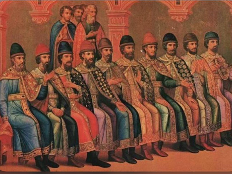 Кремлевский дворец наполнен знаменитейшими мужами русского царства, духовными и мирскими. Митрополит Макарий, десять святителей, все архимандриты, игумены, бояре и во главе Царь Иоанн IV.