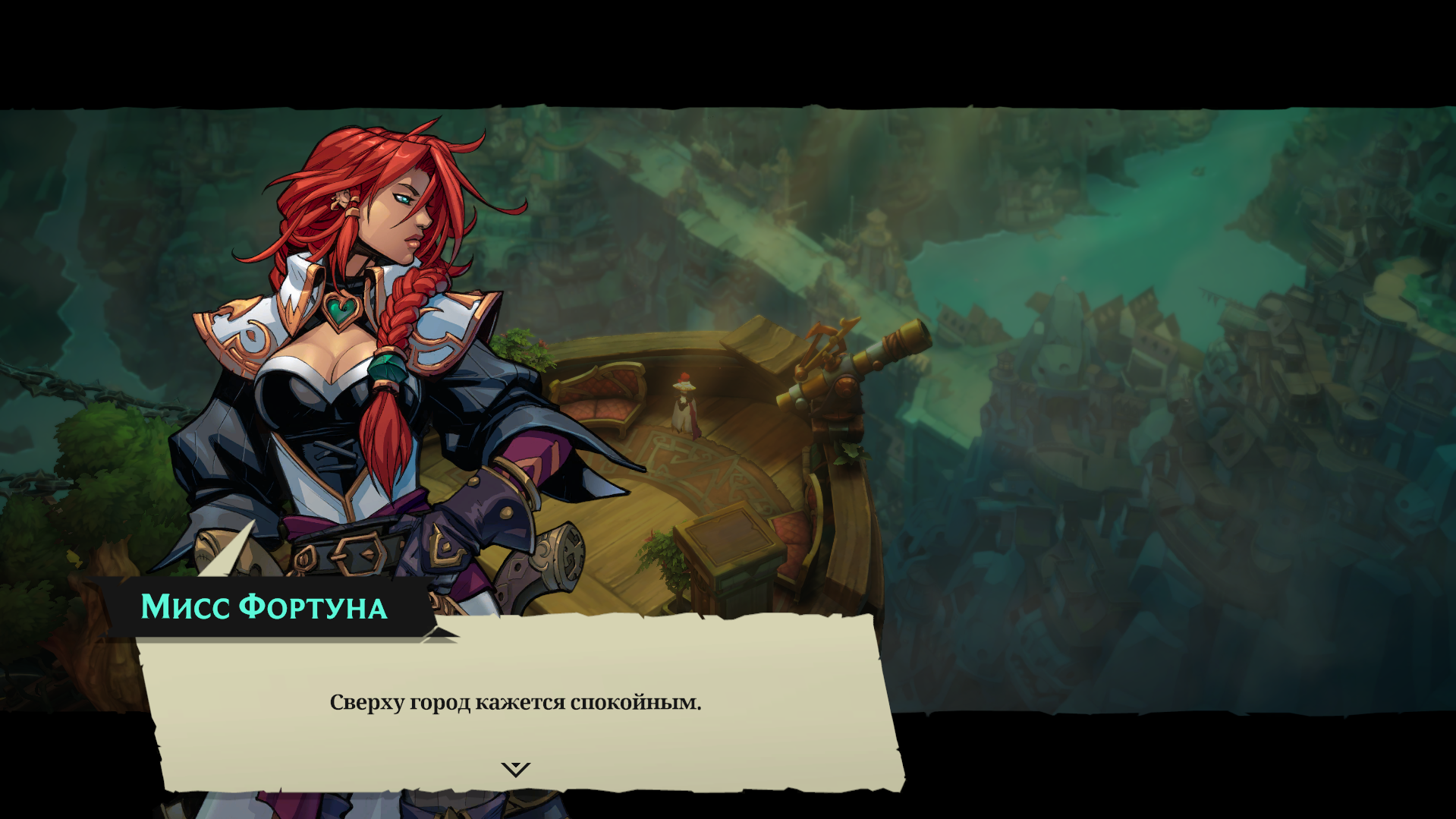Теперь к тому, что происходит внутри игры. Меня сильно порадовала визуальная составляющая игры. В начале, еще перед тем как открылось меню, был классный ролик с небольшой предысторией, все последующие ролики в игре были другими, но все такими же классными. Это были даже не ролики, а, скорее, анимированные комиксы с озвучкой, я такое люблю. Очень красивые локации, тут даже нечего добавить, на экран было просто приятно смотреть. Правда, вначале мне казалось что модельки героев как-то не вписываются в окружающую среду, было странное ощущение, будто их взяли из какой-то другой игры, но со временем оно пропало. Еще мне немного не хватало эмоций у портретов героев во время диалогов. К примеру, вот скриншот из самого начала игры с самой первой репликой Мисс Фортуны. Видите ей лицо? Неважно, будет ли она в разговорах с другими персонажами злиться, смеяться, грустно вздыхать или выражать любую другую эмоцию, ее лицо останется неизменным. И если в ее случае это может быть аргументировано тем, что она суровый капитан, который никогда не показывает своих эмоций, то в случае, например, с Браумом, это абсолютно неуместно. Персонаж очень живой, он часто смеется, рассказывает воодушевляющие истории, восхищается вещам как маленький ребенок, а на портрете он с каменным лицом. Похожая ситуация и с другими персонажами, было бы хорошо видеть их эмоции в разговоре, это сделало бы героев более живыми. Недостатком это назвать нельзя, скорее это мое личное пожелание.