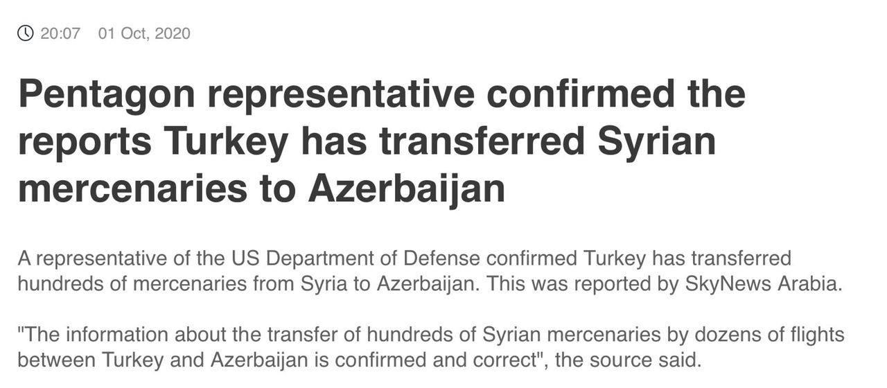 Представитель Пентагона подтвердил информацию о том, что Турция переправляла в Азербайджан сирийских наемников.