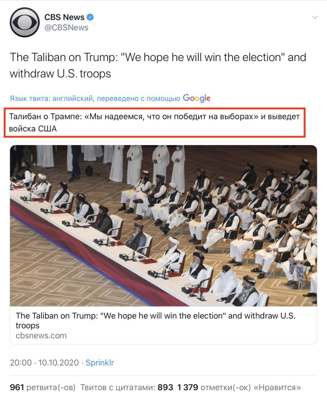 Исламистское движение "Талибан" выразил надежду на победу Трампа на выборах в США.