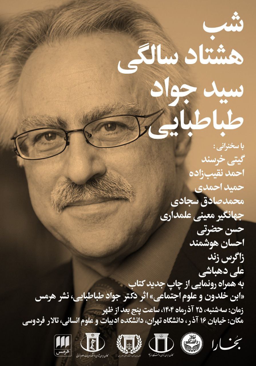 نهصد و سی و یکمین شب از شبهای بخارا به بزرگداشت سیّد جواد طباطبایی، فیلسوف سیاسی و پژوهشگر برجستۀ اندیشۀ ایرانی، اختصاص یافته است. این نشست که توسط کانونهای ایرانشناسی دانشگاه تهران و مجلهٔ بخارا در ساعت پنج بعدازظهر سهشنبه ۲۵ آذر ۱۴۰۴ خورشیدی با سخنرانی گیتی خرسند، احمد نقیبزاده، حمید احمدی، محمدصادق سجادی، جهانگیر معینی علمداری، حسن حضرتی، احسان هوشمند، زاگرس زند و علی دهباشی در تالار فردوسی دانشکدۀ ادبیات و علوم انسانی دانشگاه تهران برگزار میشود. در این شب همچنین رونمایی از چاپ جدید کتاب «ابن خلدون و علوم و اجتماعی» اثر دکتر جواد طباطبایی، منتشرشده توسط نشر هرمس، نیز از دیگر بخشهای این نشست خواهد بود.
