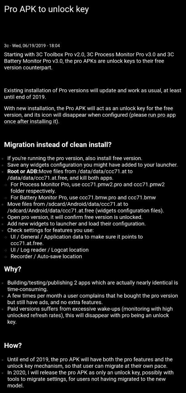 根據開發者,現在已經安裝了 Pro 的,仍然有完整功能,至少直到 2019 年完結前,仍然有完整功能。但新安裝的,就只會是一個 Pro Key,需要同時安裝免費版才能正常使用。