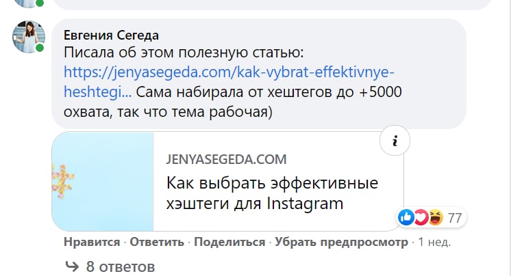 Недавно прокомментировала в Facebook пост о хештегах ссылаясь на свою статью. Через неделю смотрю, охват статьи со 100 человек вырос до 2000.