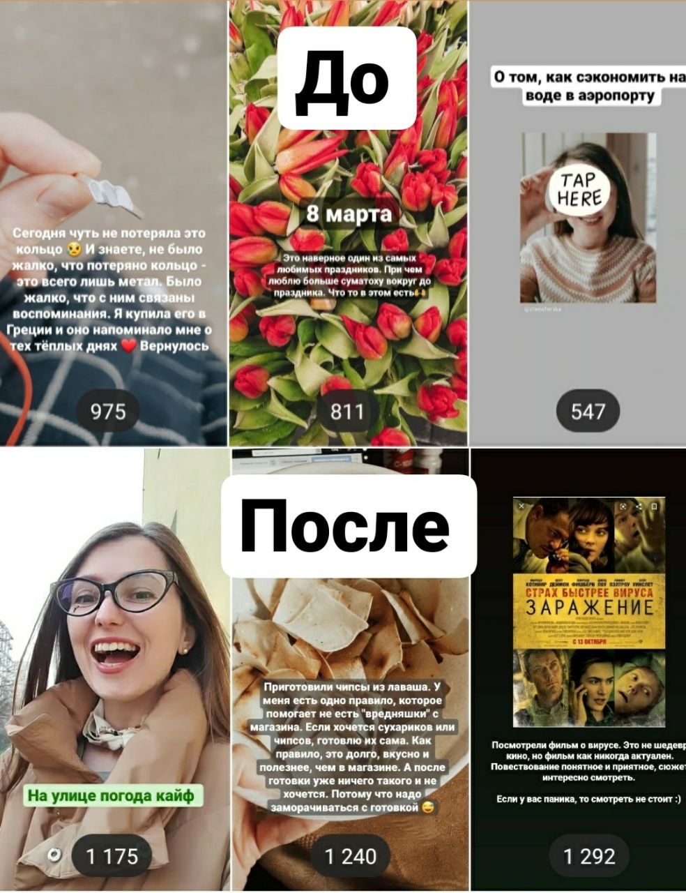 Обычно мои сторис выходили так: один день их 5, другой 20, третий – 0. Суть эксперимента в том, чтобы регулярно публиковать истории в течении дня. Не менее 5 и обязательно в разное время дня. Скрины До / после прикрепила.