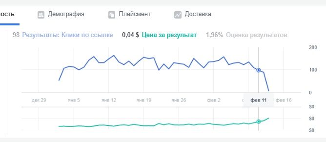 Продолжаю крутить таргет на блог. Сейчас цена за клик выросла с 0,02 $ до 0,05$. Хорошо видно на скрине (зелёная линия). Начала расти еще в начале февраля до 0,03 $. Мне такой результат ОК. Но последние 3 дня клик стоил 0,04-0,05 $ и я отключила рекламные кампании.