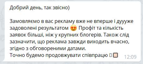 Обожнюю, коли рекламодавці залишають такі відгуки після розміщення реклами на моєму каналі ❤️