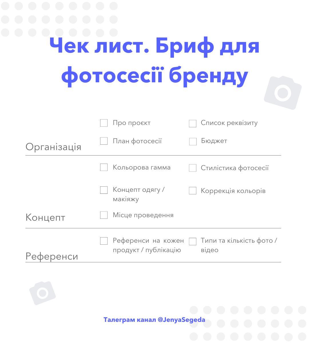 Склала чек лист підказку, що слід додати в бриф для фотосесії бренду ❤️