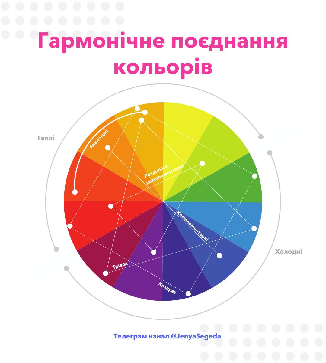 Аналогові кольори — поєднання кольорів, які розташовані поруч один з одним на колі. Приклад: 🟥🟧🟨. Може бути в теплих та холодних відтінках.