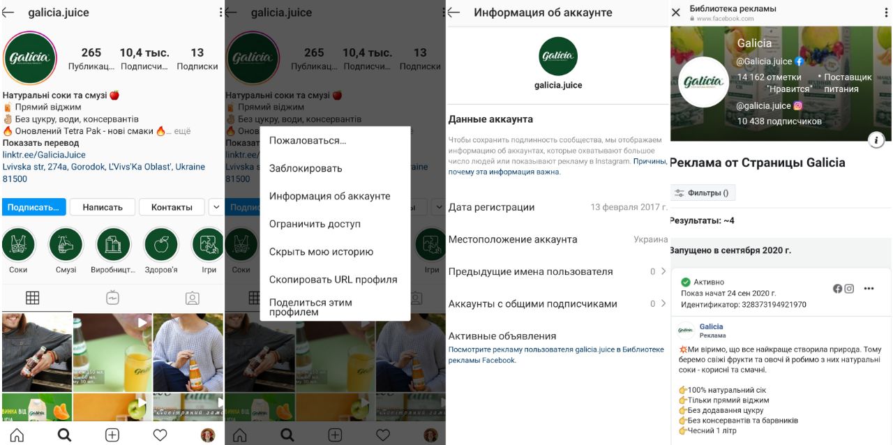 2️⃣ Способ. Заходите на профиль конкурента в Instagram, нажимаете три точки -> Информация об аккаунте -> Активные объявления -> попадает в библиотеку рекламы Facebook и видите рекламу конкурентов.
