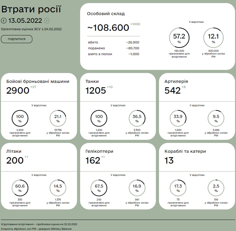 Нова статистика втрат РФ станом на 13.05.2022 👇🏻